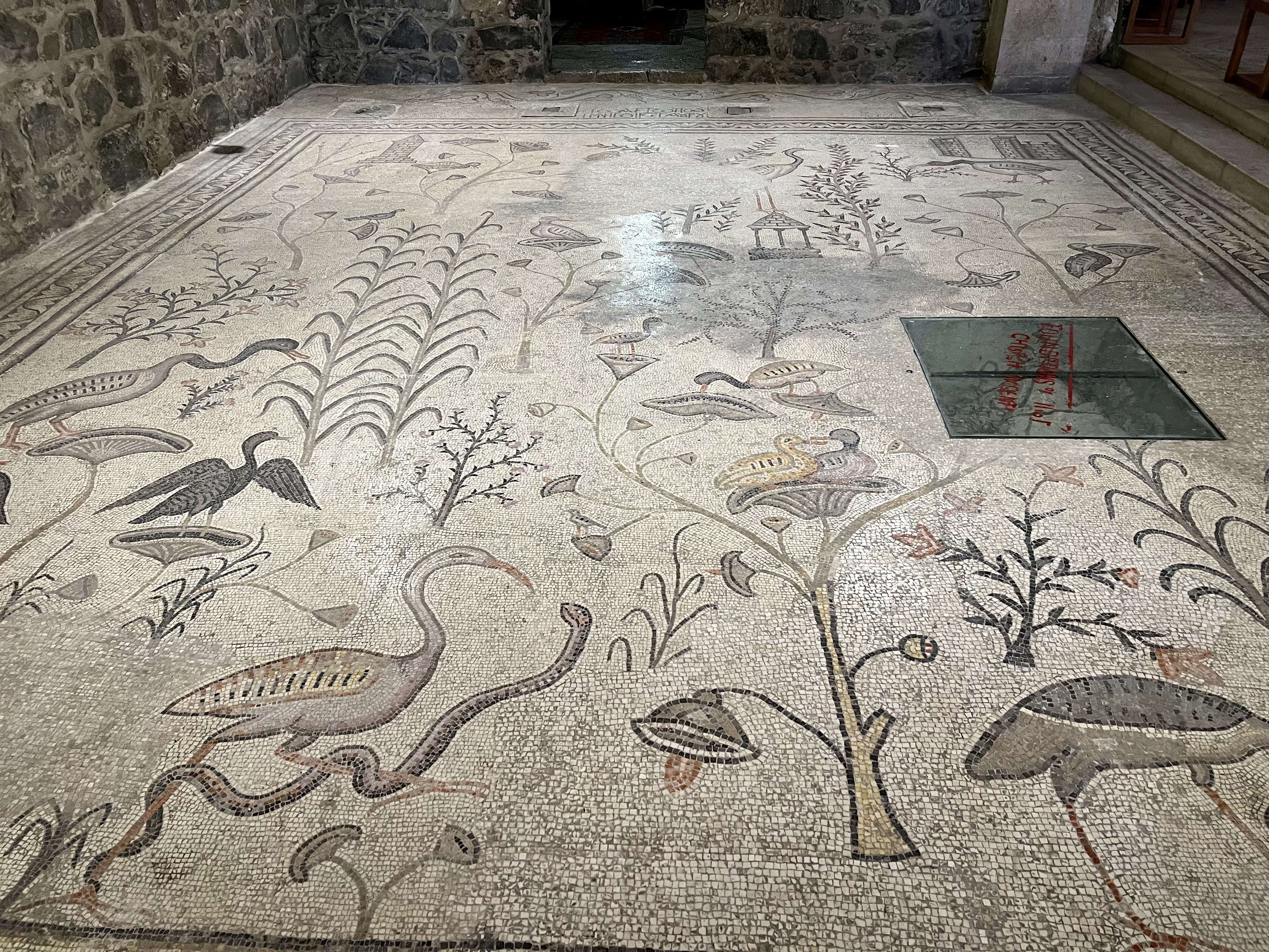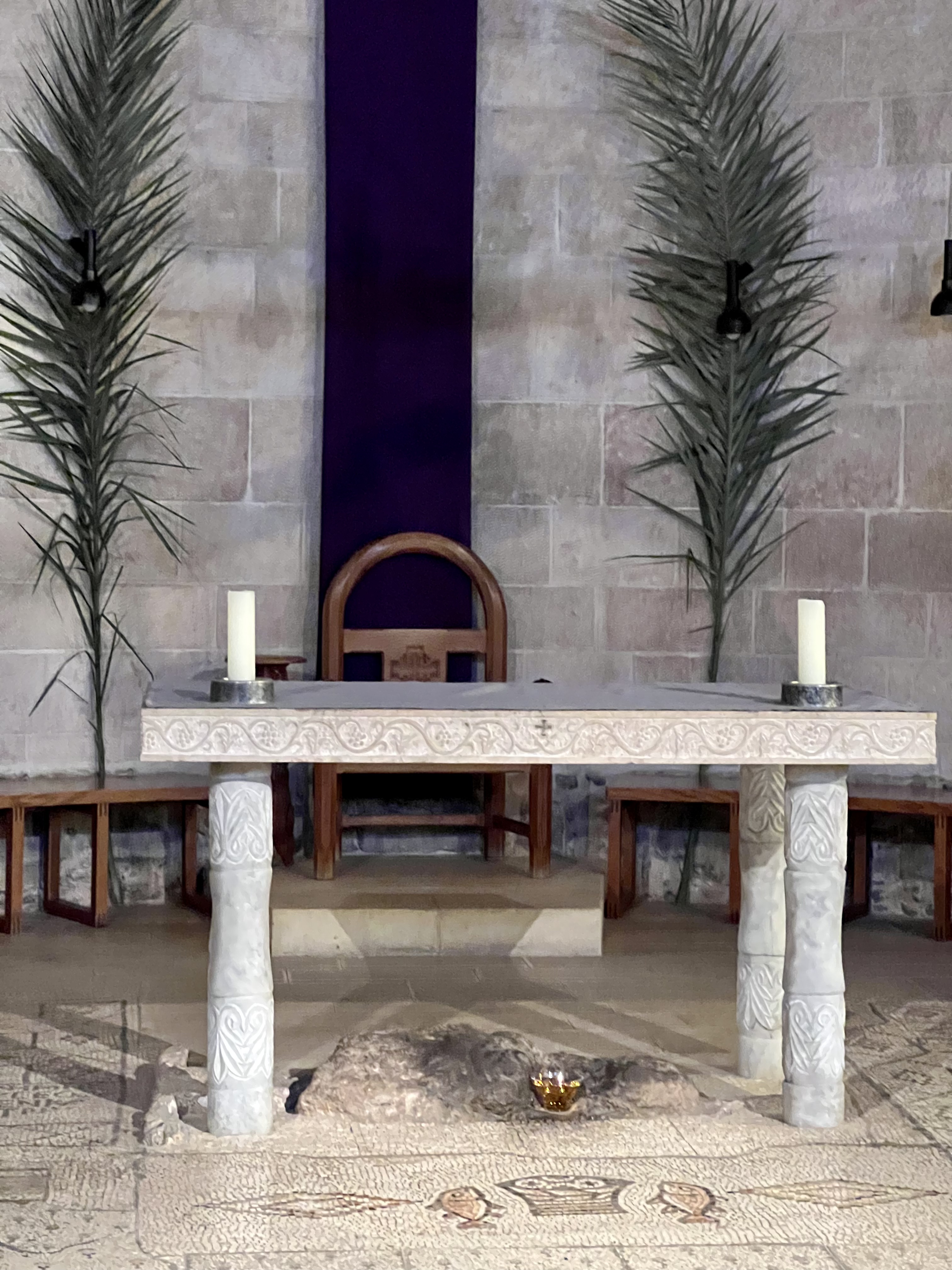 From there, we went on to the northernmost shore of The Sea of Galilee, to the Church of the Multiplication of Loaves and Fishes. This was again a beautifully serene site. The existing church is rather new, but the mosaic floor tiles therein date back to the fifth century church which stood on the site. The floor mosaics are in fact the earliest known examples of figurative floor mosaic Christian art in the Holy Land, and they are beautiful. (Note the loaves and fish mosaic just in front of the alter, and the rock beneath, which has been identified as the slab of limestone on which the meal was laid.)