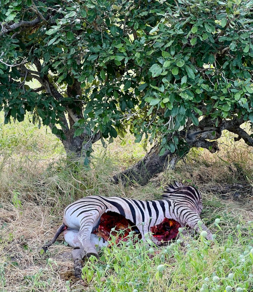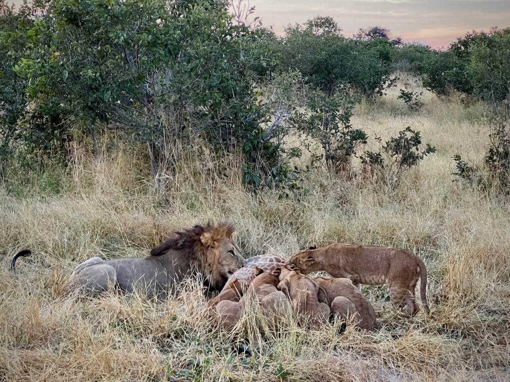 When we made it to the site of the kill we saw the lioness who made the initial kill walk away, her mouth and face fully blood stained, to allow the lion the first opportunity to feast on the morning kill. Soon the cubs joined in, followed by the female lions.