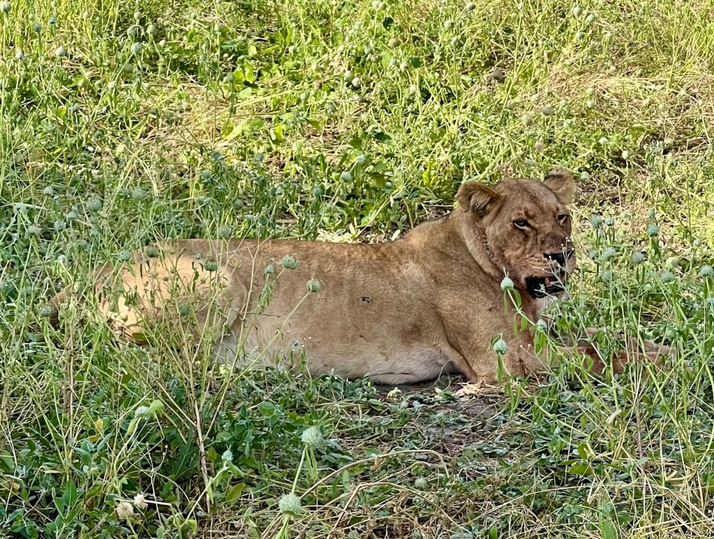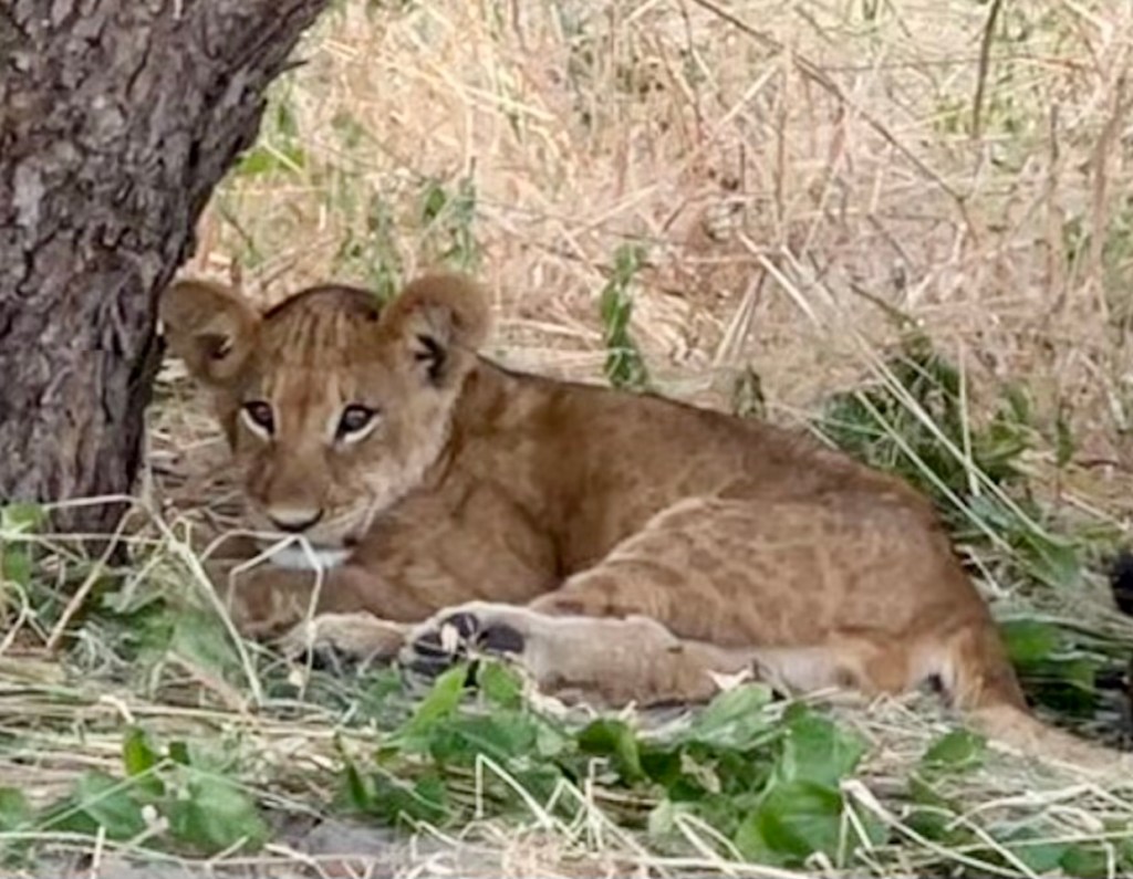 Early in our first afternoon game drive we rounded a tree line corner and came up on a pride of lions sleeping. There were three females on the parameter, a large male deep in the grasses under the tree and the rest were cubs lying between them. As you can see in the images that follow, they were not at all concerned by our presence.
